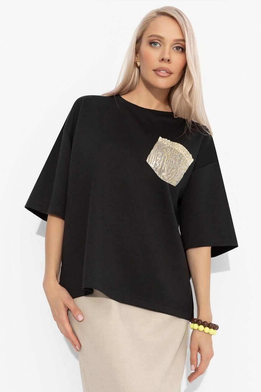 Футболка чёрная с карманом из пайеток от компании Charutti. Модель прямого силуэта, выполнена из трикотажной ткани "милано". Круглый вырез горловины. Короткие рукава. Идеальный выбор на каждый день.