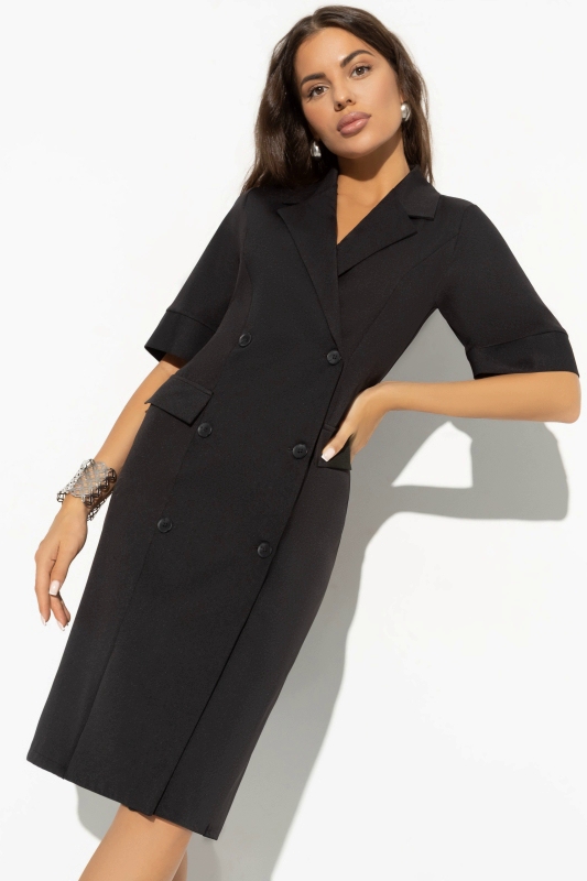 Платье чёрное с английским воротником от компании Charutti. Модель полуприлегающего силуэта, выполнена из костюмного полотна "барби". V-образный вырез горловины на запах. Втачные короткие рукава с манжетами. Двубортная застёжка на петли и пуговицы. По бокам клапаны. Идеальный выбор для Вашего летнего гардероба.