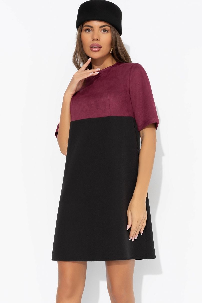 Платье комбинированное короткое с карманами от компании Charutti. Модель прямого силуэта, Комбинация двух видов ткани: замша на скубе, «барби». Круглый вырез горловины. Втачные короткие рукава. По спинке застёжка на пуговицу. Идеальный выбор на каждый день.
