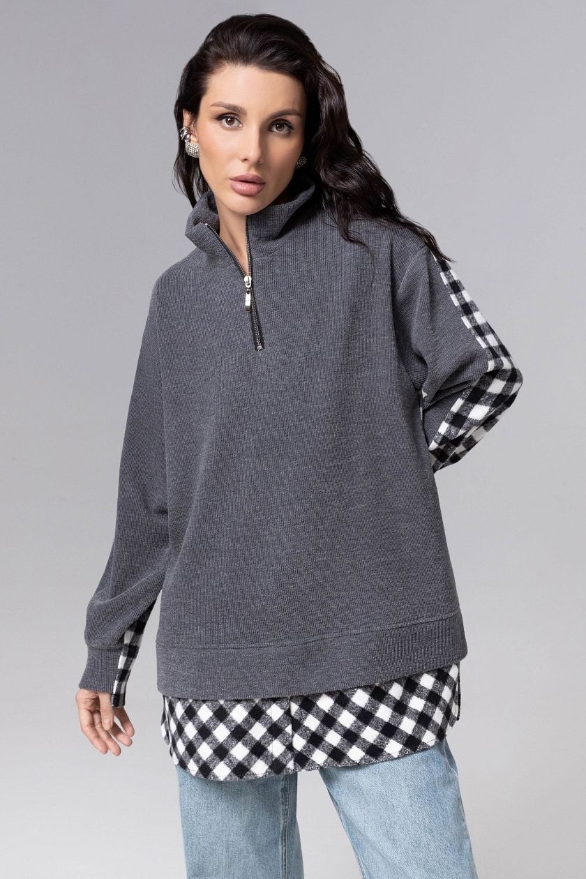 Свитшот тёмно-серый комбинированный от компании Charutti. Модель свободного силуэта, комбинация двух типов ткани. Рукава длинные на манжетах. Застёжка на молнию. Это не просто свитшот – это манифест современного стиля и must-have нескольких будущих сезонов.