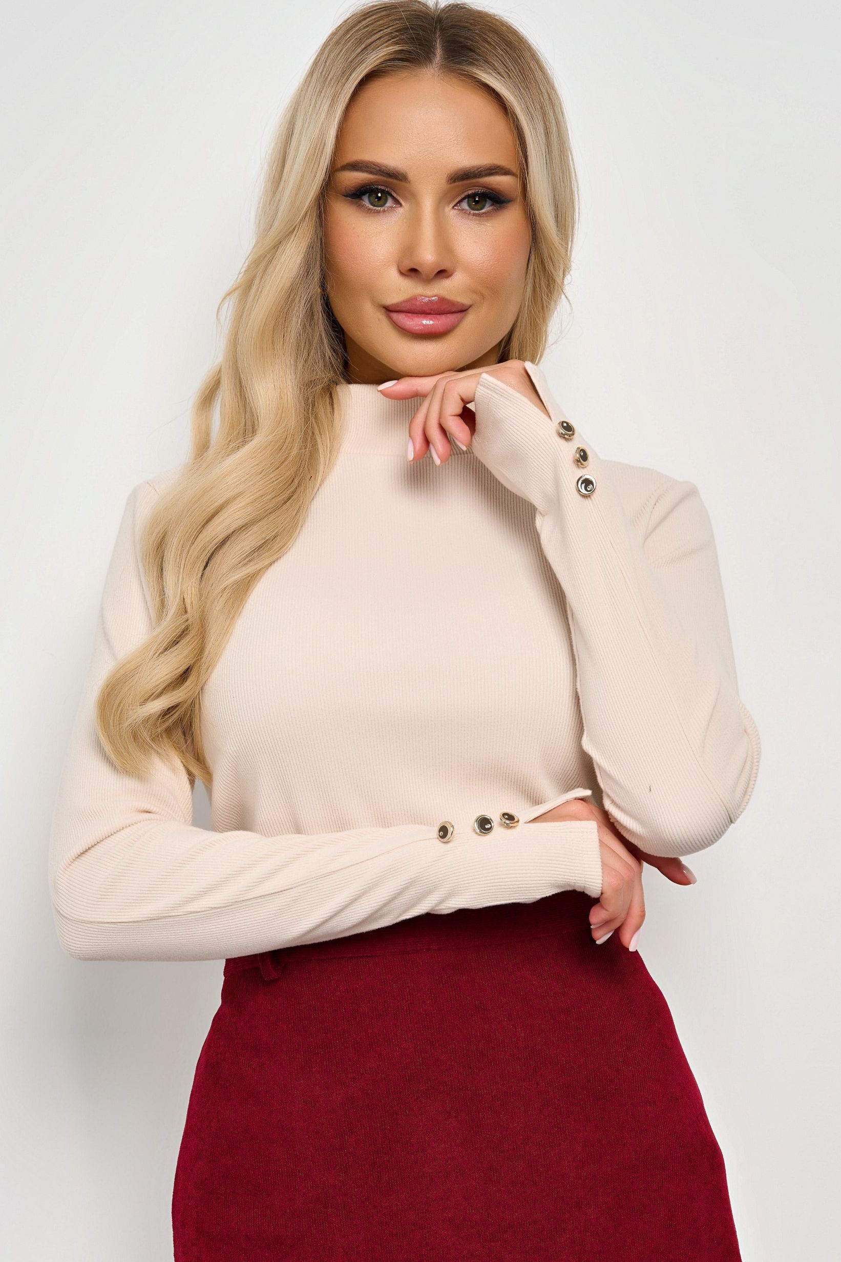 Лонгслив трикотажный светло-бежевый от компании Jetty. Модель прилегающего силуэта. Длинные рукава с разрезами и декоративными пуговицами. Горловина оформлена воротником-стойкой. Прекрасный образ для встречи с подругами.