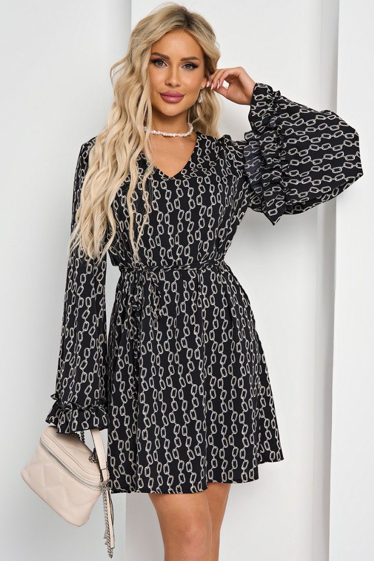 Платье чёрное с рукавами клёш от компании Jetty. Модель свободного кроя, выполнена из плательного полотна с геометрическим принтом. Платье с вшитыми длинными завязками в боковые швы, которые позволяют акцентировать талию. V-образный вырез. Длинные рукава с воланами на манжетах. Идеальный выбор для создания женственного образа.