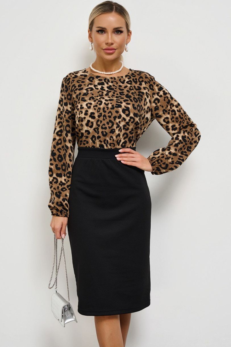 Платье-футляр комбинированное от производителя Jetty. Модель полуприлегающего силуэта, Длинные втачные рукава оканчиваются сборкой на резинку. Круглый вырез горловины. Верх изделия выполнен из плательной ткани, низ из эластичного трикотажа. Идеальный выбор на каждый день.