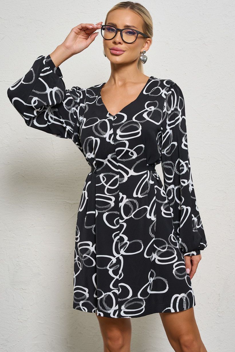 Платье короткое чёрное с принтом от производителя Jetty. Модель полуприлегающего силуэта, выполнена из плательной ткани. V-образный вырез горловины. Втачные длинные рукава на манжете. Без застёжки. Платье дополнено завязками, которые можно завязать как по переду, так и по спинке. Идеальный выбор на каждый день.