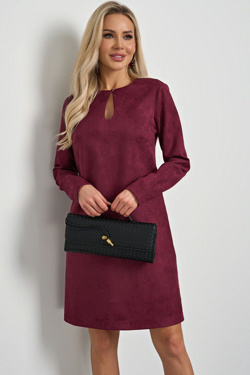 Платье вишнёвого цвета из искусственной замши от компании Jetty. Модель прямого свободного силуэта. Длинные втачные рукава. В верхней части переда расположен разрез в виде капли, который фиксируется застежкой на петлю и пуговицу. Отличный выбор для создания элегантного образа.