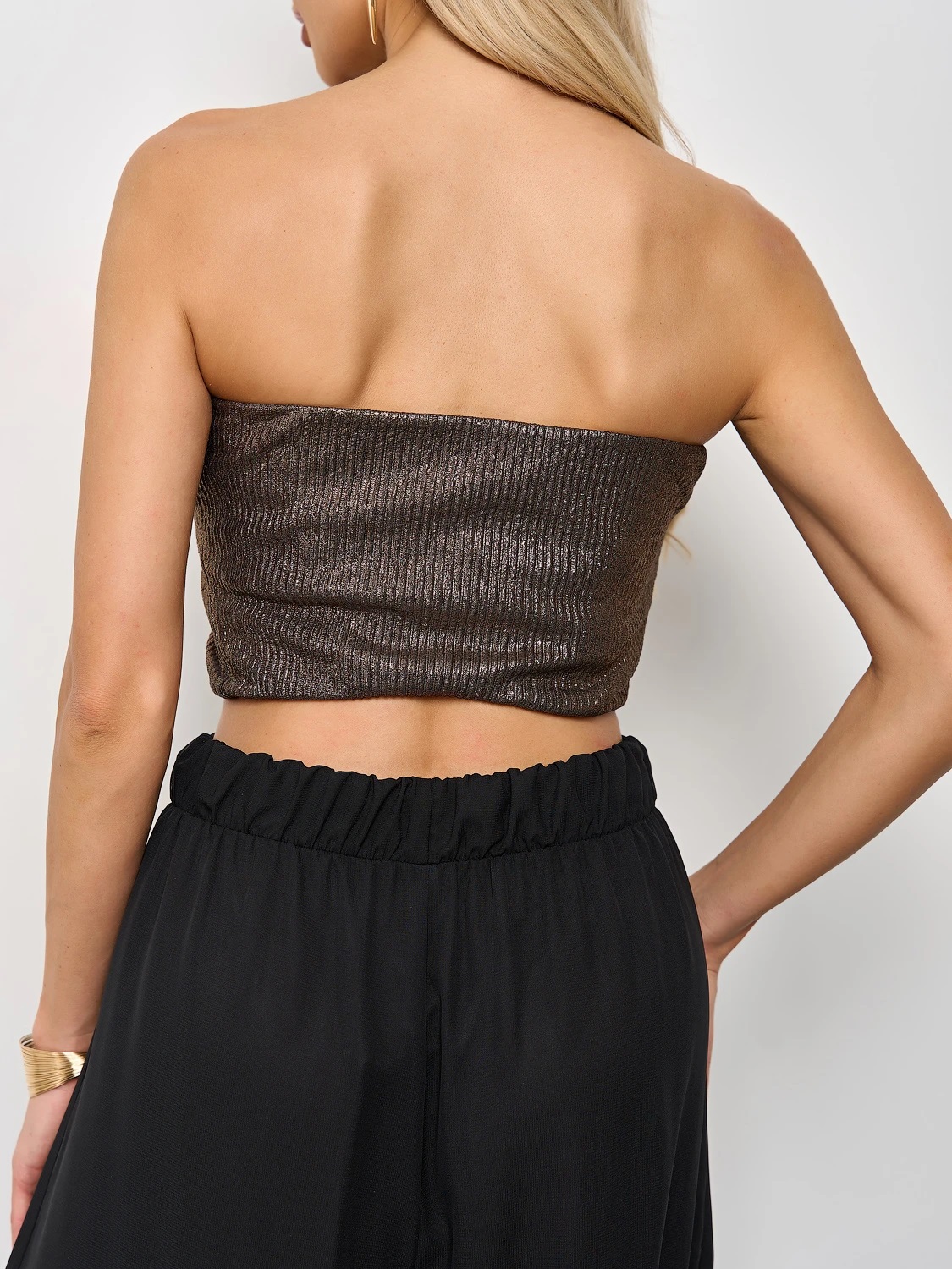 Топ-бандо бронзовый из блестящего трикотажа от производителя Jetty. Модель прилегающего фасона, без рукавов. По переду изделия верхний край украшен перьями. Без застёжки. Отличный выбор для создания модного и стильного образа.