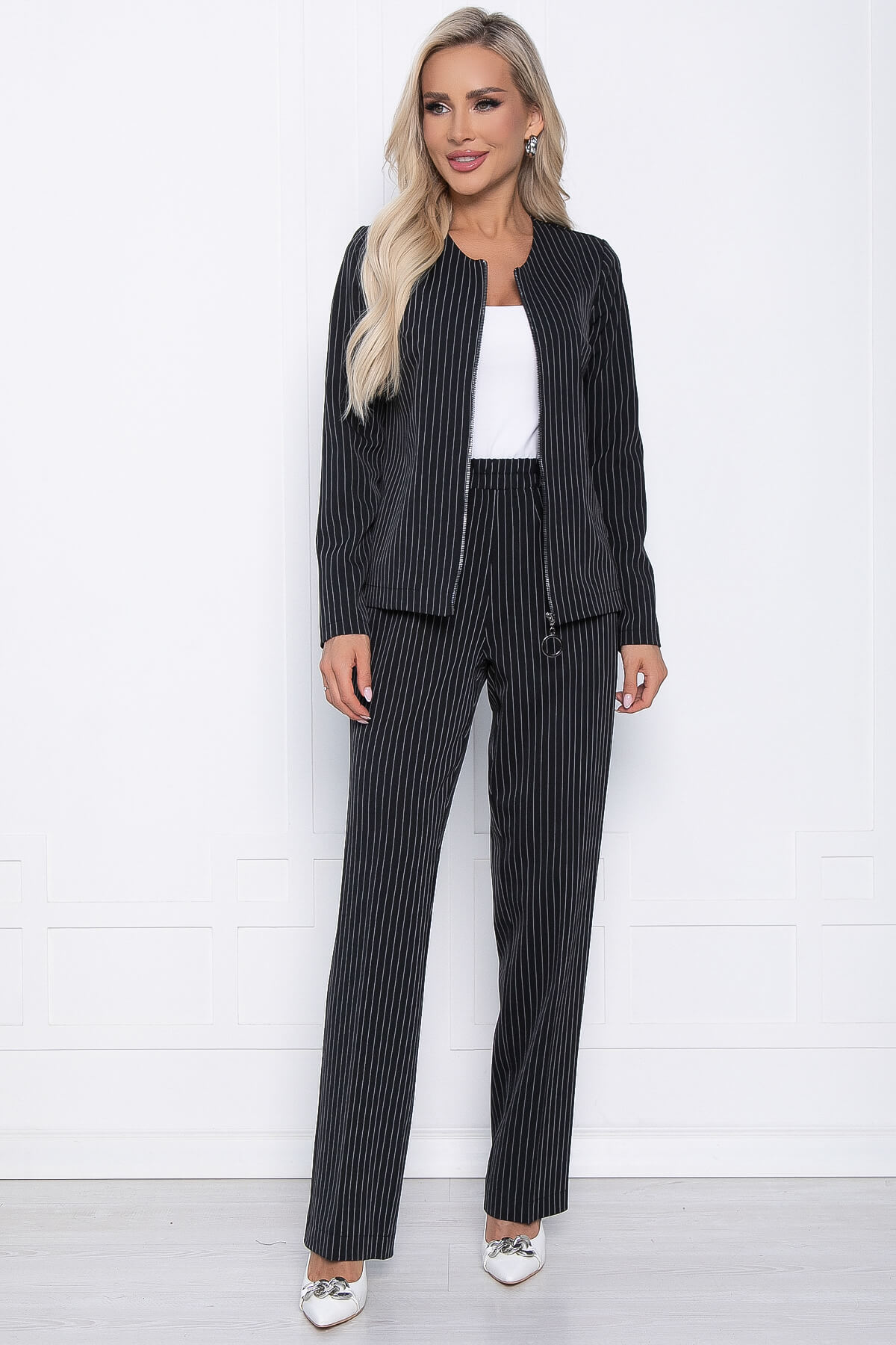 Костюм-двойка чёрный в полоску с брюками и жакетом от компании Taiga, выполнен из костюмного полотна. Жакет прямого силуэта, с длинными рукавами, застёжкой на молнию. Брюки прямого силуэта, с резинкой на поясе и карманами по бокам. В повседневном образе смело сочетайте с лоферами или ботинками, а если нужен более официальный образ, с туфлями на каблуке. Рекомендована ручная стирка при 30 С. Допуск отклонения длины при массовом производстве 1-3 см является нормой.
