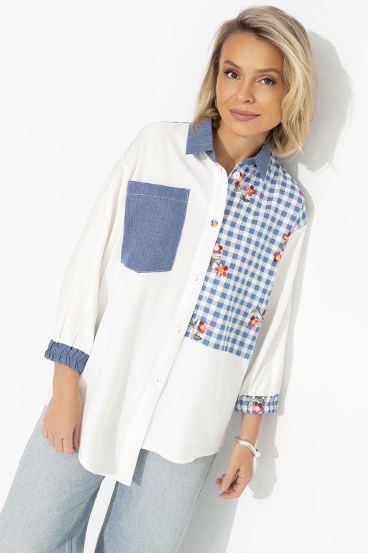 Рубашка белая комбинированная от компании Charutti. Модель свободного кроя с ассиметричным низом, выполнена из «хлопок с вышивкой», «штапель», «габардин». Рукав укороченный, оформлен широкой скрытой резинкой. Изделия дополнено вставками из акцентного материла. Изделие хорошо смотрится в заправленном виде и навыпуск. Идеальный выбор для городских модниц.