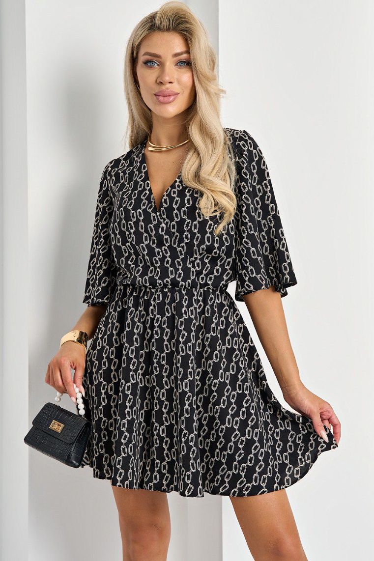 Комбинезон чёрный с юбкой-шортами от компании Jetty, выполнен из плательного полотна с принтом. Имитация запаха по переду верха. Талия отрезная, на резинке. Верх с подкладкой из основной ткани. Открытая спина. Втачной расклешенный рукав. Для фиксации запаха на спине предусмотрены завязки. Стильный вариант на лето.