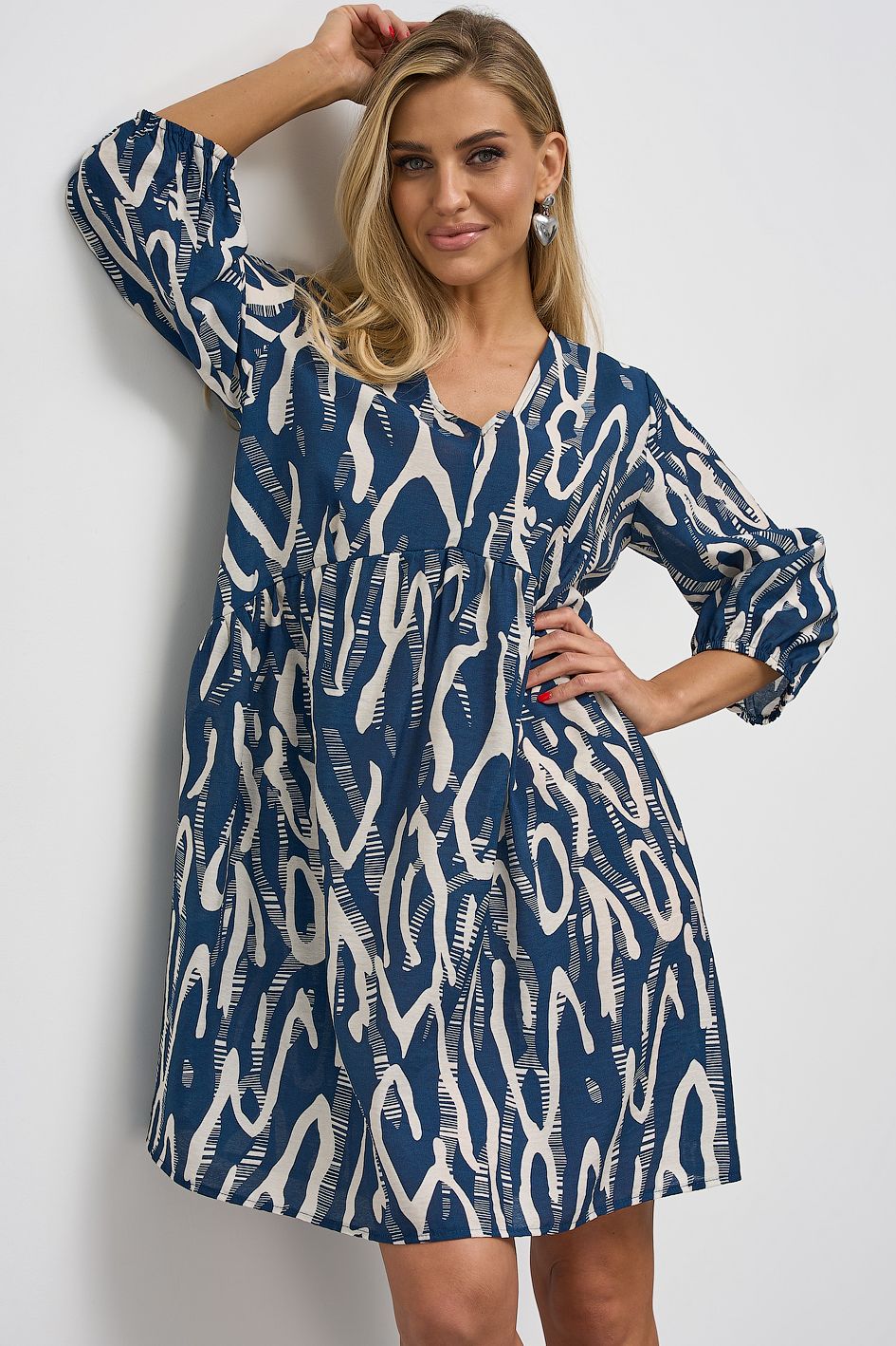 Платье короткое синего цвета с завязками по спинке от компании Jetty. Модель выполнена из хлопковой ткани с принтом. V-образный вырез горловины по переду и спинке. Втачные рукава длиной 3/4 на резинке. Отрезное под грудь. Идеальный выбор для создания женственного образа.